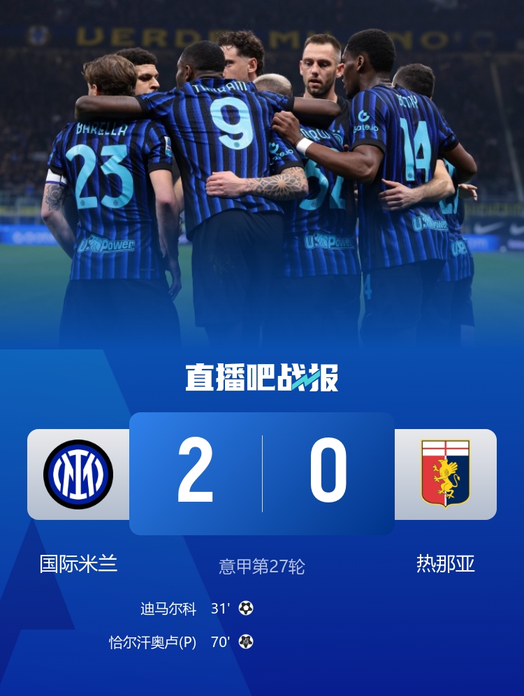国米2-0击败热那亚,意甲豪取8连胜,近15轮14胜1平!先赛暂时13分领跑积分榜!