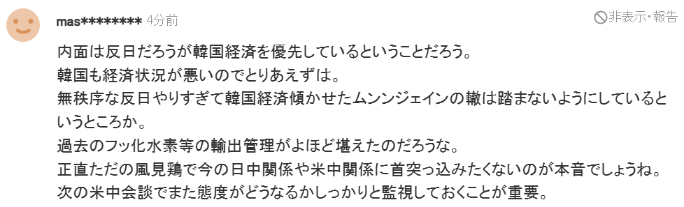 “即便他(指李在明)内心深处反日,但表面上看来,他似乎更重视韩国经济。韩国目前的经济形势也不容乐观,所以他想避免重蹈文在寅的覆辙——文在寅过度反日,导致韩国经济衰退。过去对氢氟酸等物质的出口管制想必给他带来了沉重的打击。说实话,他不过是个见风使舵的人,他真正的意图或许是不想插手当前的日中或美中关系。下次中美峰会上,他的态度值得密切关注。”
