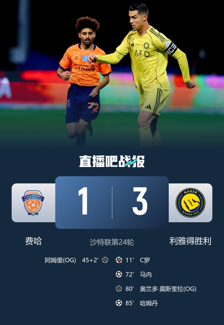 利雅得胜利客场3-1逆转费哈,胜利取得联赛10连胜,积61分位居榜首,领先第2名吉达国民2分。